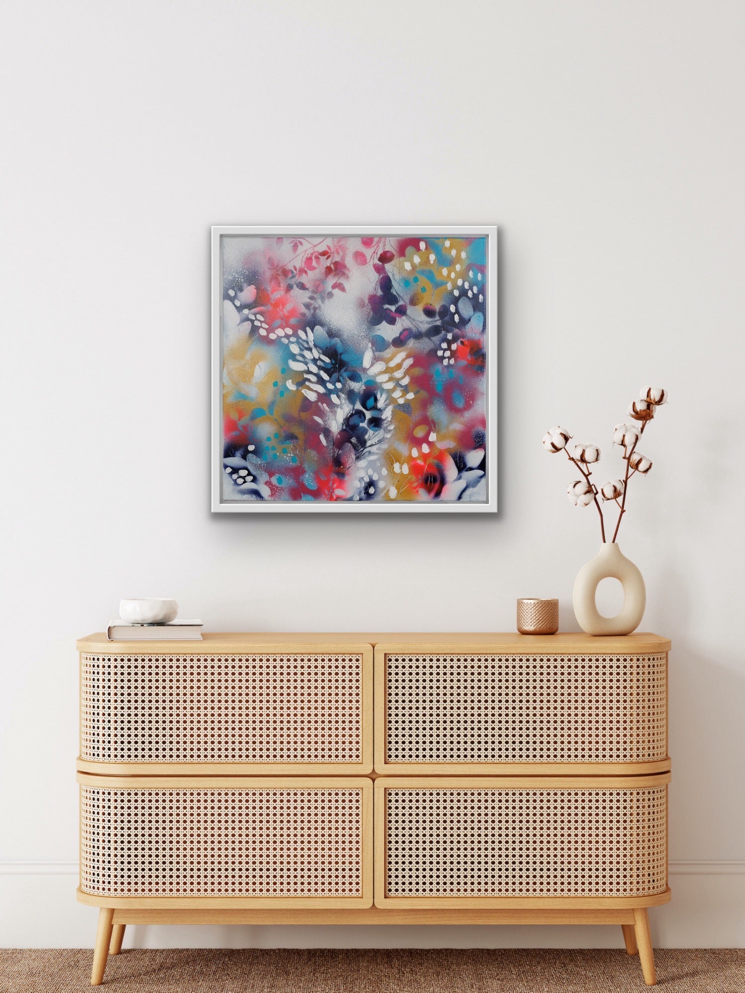 "Á meðan ég vinn finn ég oft að ég dregst að ákveðnum orðum eða textabrotum sem virðast fanga kjarnann í því sem málverkið er að reyna að segja. Ég skrifa þau niður í minnisbók eða inn í málverkið sjálft og leyfi þeim að síast inn í verkið og orkuna í kringum mig. Þegar málverkinu er lokið sest ég niður með dagbókina mína, horfi á verkið og byrja að skrifa út frá því sem kemur til mín. Ef það er texti eða skilaboð með myndinni kemur hann alltaf áreynslulaust til mín. Hvert málverk segir sína sögu eða kemur með skilaboð og ef ekkert kemur til mín veit ég að litirnir og myndirnar vilja fá að standa ein og sér án texta.